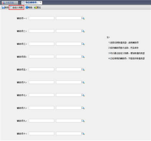 第二步:创建辅助项以及辅助项内容。点击上图中的“自定义档案”按钮,弹出页面,如下图所示。