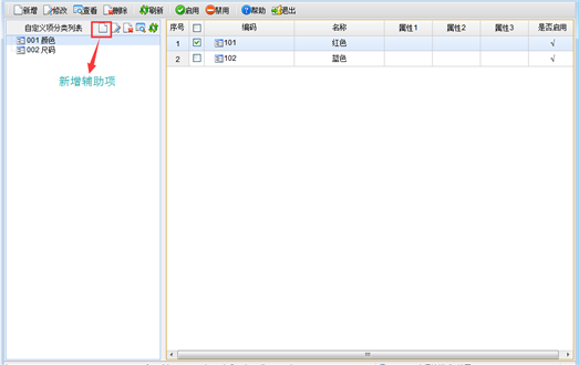 以增加物品“颜色”和“尺码”辅助项为例,说明物品辅助项设置方法。