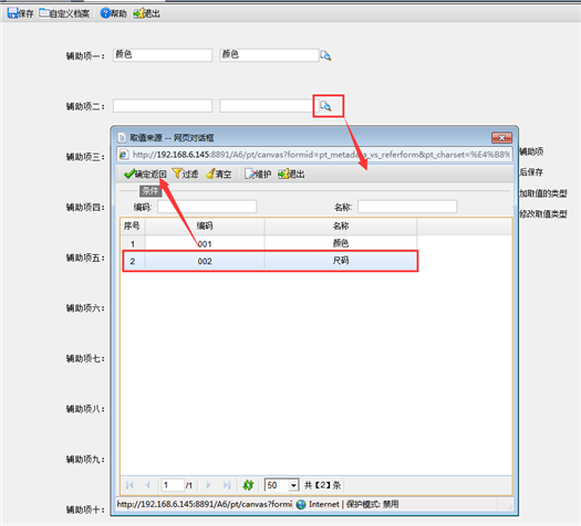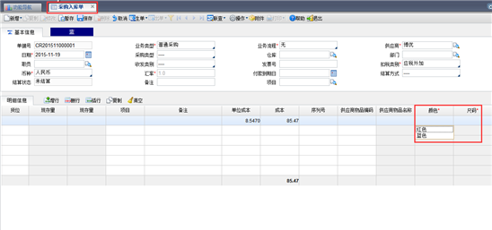 - 对于有效的物品辅助项及物品辅助项内容,可以在启用了物品辅助项的物品有关的单据中被引用。比如,物品A中使用颜色和规格物品辅助项,采购入库单明细列表中显示颜色和规格物品辅助项,且选择A物品后,可以选择颜色和规格物品辅助项的内容。