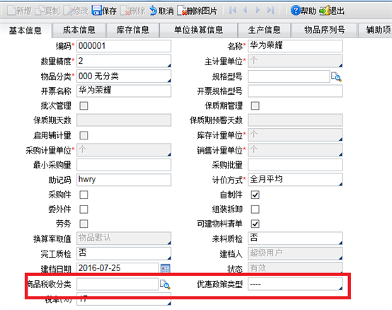 最后在物品档案中设置物品的“商品税收分类”和“优惠政策类型”,如下图:
