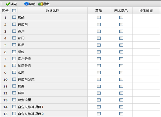 提示数量 | 设置当有几条数据同名时系统给出提示信息。如设置为“2”,则当助记码相同的数量≥2时,系统弹出符合条件的数据列示页面,此信息也可以通过“导出”功能导出。 |