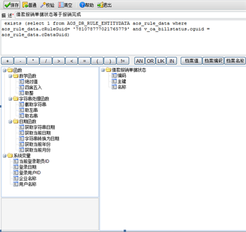 也可通过点击“高级”按钮,通过点击组合成符合规则的SQL语句来控制数据权限内容。之后可以通过“校验”按钮来,校验SQL语句是否可用。点击“保存”,如下图所示。
