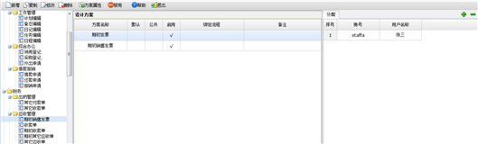 单据设计页面左侧为系统各模块单据树形结构,中间显示具体单据方案,右侧列出方案的分配情况,可以为方案指定一个或多个账号,该账号登录系统后可以使用该方案,如下图所示。