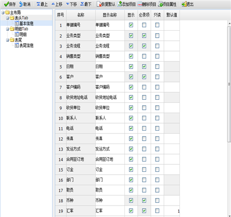 【第一步】在左侧选中要增加方案的单据,点击“新增”按钮,打开新增方案页面,设置单据各项目的显示名称、必录项、只读、默认值等信息,如下图所示。