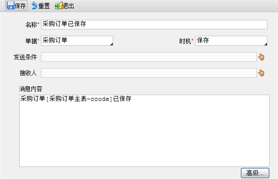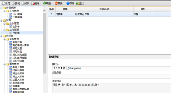 功能:设置单据自动发送消息的规则,对规则可以进行保存、修改、删除等操作。