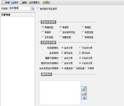 【第二步】在生成凭证列表界面点击“选项”按钮,显示选项设置界面,设置凭证生成的合并条件、分录合并方案以及例外科目并保存,如下图所示。