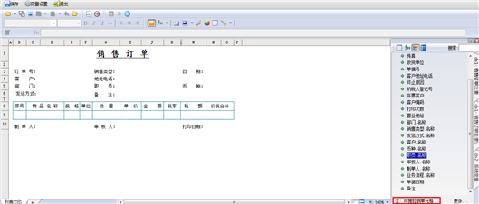 页面左侧为模板样式,右侧为打印变量列表,可以拖拉变量添加至左侧单元格。
