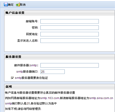 【第二步】在邮件设置页面,填写账户信息设置和服务器设置。点击“确定”按钮,完成邮件设置工作。