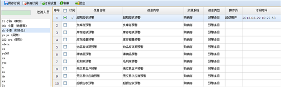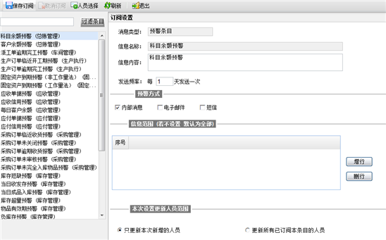 人员选择 | 选中一条预警,点“人员选择”按钮,弹出人员参照对话框,可勾选多个用户,确定后,点击“保存订阅”,则这些用户将预定该条预警。 |