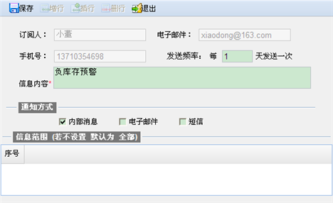 信息范围 | 默认为全部,比如,“库存不足”,默认参数为仓库和物品,“超期应收”默认参数为客户等;用户也可以设置自己关注的具体参数范围。 |
