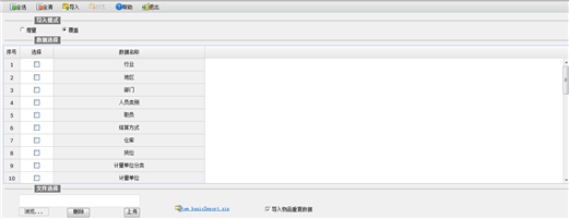 【第三步】选择要导入的数据及导入模式。系统提供两种导入模式,即增量与覆盖。增量将在目标账套导入系统不存在的导入数据,覆盖则将目标账套的原数据用导入数据覆盖。