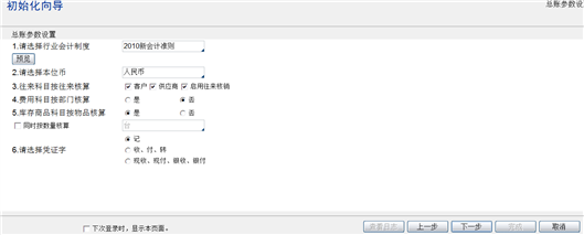 总账业务配置,主要设置系统会计制度、总账默认币种、凭证字以及部分科目核算如下图所示。