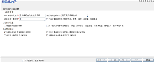 固定资产配置,主要有单据、折扣、结账控制三个方面的相关设置如下图所示。