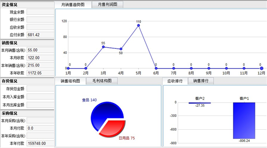 今日看板是指通过对财务与业务数据的分析,以更加快捷方便的图表形式将月销售趋势/利润,销售/毛利结构,应收/销售排行信息展示给企业领导者。其它信息还包括:资金情况、销售情况、存货情况、采购情况。