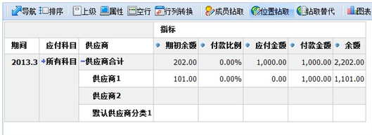 - 应付金额:某应付科目下某供应商在查询期间的借方发生额合计值