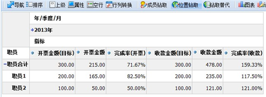 分析企业销售业绩目标完成情况。通过对目标值、实际完成情况的对比,分析企业业务人员的业绩完成情况。