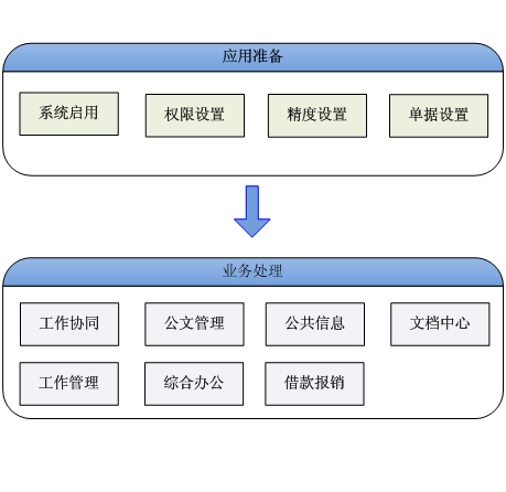 用户在初次使用协同管理子系统时,需要先做应用准备、再进行业务处理。操作流程图如下图所示: