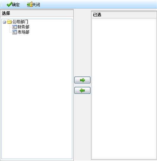 按钮,所选部门显示右边已选框中。取消已选部门,选择右边已选框中的部门,点