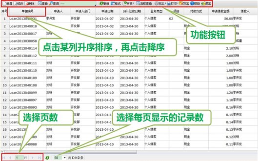 单据列表的界面区域(以借款列表为例)如下图: