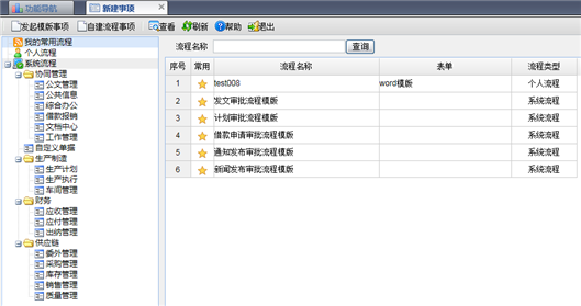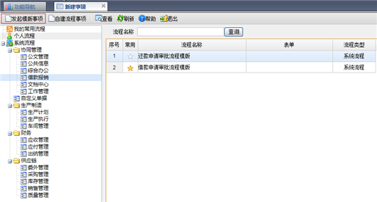 - 新建事项的列表包含登录用户的启用个人流程模版。