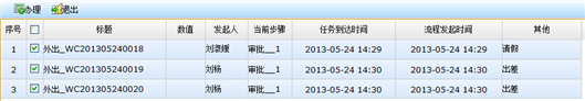 系统显示批量办理列表,列出待办事项列表中与所选记录同类型的所有记录(同类型指:相同的流程模板、相同的模板版本、相同的流程任务节点)。用户根据实际需要在批量办理列表中选择需要批量办理的流程实例。如图: