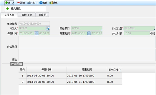 第三种:流程事项办理人查看流程状态是进行中的流程事项,可以补充意见(审批人审批后还可以补充意见)跟踪和打印。