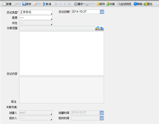 日记类型 | 默认为工作日记,可选择为个人日记、工作周报,选择个人日记时,可以选择分享范围,分享范围的人员都能看到此个人日记。 |