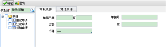 左侧为可选择生成凭证的单据类型,包括借款申请、还款申请、报销申请。右侧包含常规条件和其他条件,通过输入单据日期、金额、币种等进行筛选。
