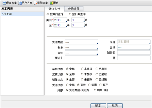分录条件:指按凭证摘要、科目、金额、结算方式,结算号,币种,供应商,部门,职员,物品,仓库等分录信息进行查询。