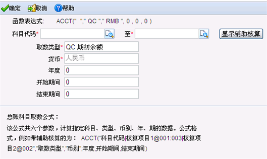 - 显示辅助核算:若需要设置取数的辅助项,则点击〖显示辅助核算〗按钮,进行设置。