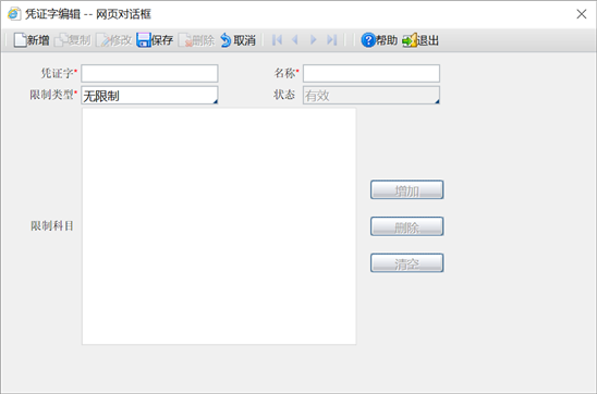 修改时,选中要修改的凭证字,点击〖修改〗按钮,可修改凭证字的“凭证字、名称、限制类型、限制科目”项目,修改完成后点击〖保存〗按钮进行保存。凭证字状态默认为“有效”,基础版不可修改。