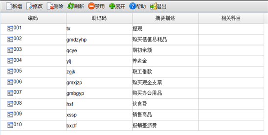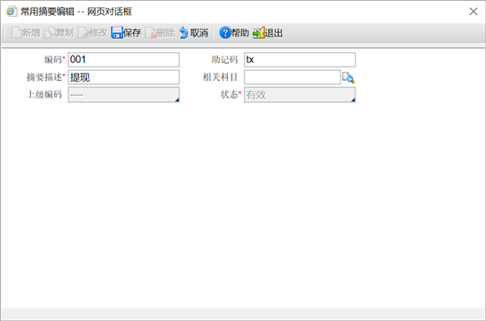 - 助记码:用户自定义输入,录入助记码后,在凭证录入时输入助记码,可调出摘要描述信息。