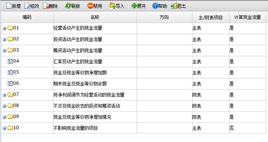 为了方便用户能够简单快捷的编制现金流量表及其附表,本系统在软件中预置了“企业现金流量项目”。用户可以根据单位实际需要对预置的主/附表项目进行修改、删除。