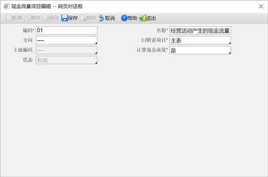 【第二步】系统在软件中预置了“企业现金流量项目”,通过“新增、修改、删除、禁用”按钮也可以对现金流量项目进行维护。在现金流量项目页面,双击某一现金流量项目,则进入现金流量项目编辑页面,如下图所示: