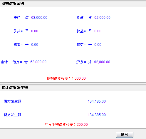在科目期初页面,点〖试算〗按钮,即执行自动试算平衡,在试算平衡页面,显示期初借贷方平衡状况及累计借贷发生额的平衡情况。如系统显示不平,则需要对期初数据进行调整后再执行“试算”。如下图所示: