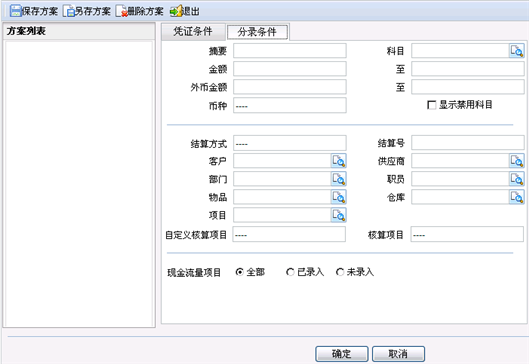 分录条件 指按凭证摘要、科目、金额、结算方式,结算号,币种,供应商,部门,职员,物品,仓库等分录信息进行查询。基础版不提供“项目”和“自定义核算项目”查询。