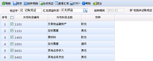 【第一步】点击【功能导航/财务/总账管理/转账/期末调汇】 菜单项,进入期末调汇页面,系统自动显示要计算汇兑损益的科目。如下图所示: