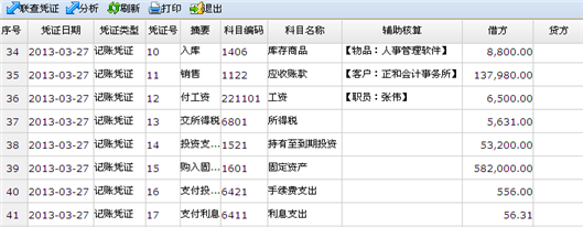 【第四步】选择明细行点击〖明细〗按钮,根据选择的有效现金流量数据行,显示所涉及凭证的日期凭证号、摘要、科目、辅助核算、借方金额、贷方金额、分配金额。如下图: