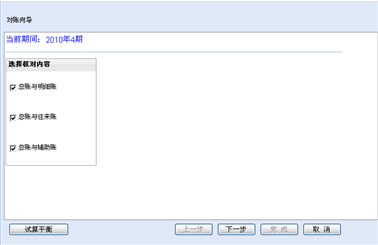 【第一步】点击【功能导航/财务/总账管理/期末处理/对账】菜单项,进入对账向导第一步,如下图所示: