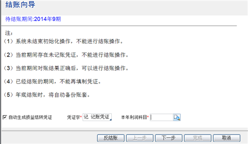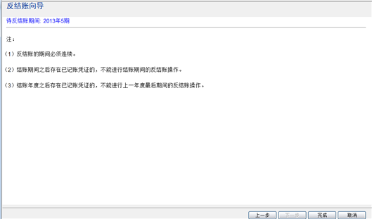 - 若存在选择的期间的后一个期间已记账凭证,则不允许反结账,需要先将凭证反记账,然后再进行反结账。