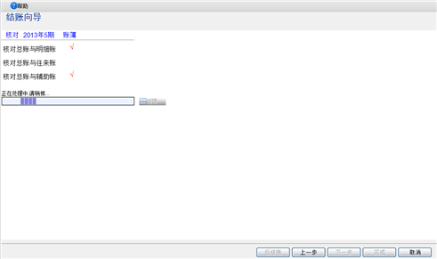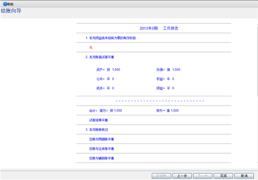 【第三步】账薄核对无误后,点击〖下一步〗按钮进入结账向导第三步,如下图所示点击〖完成〗按钮,完成结账。
