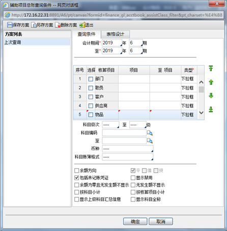 - 核算项目:选择所需查询的辅助核算,并可录入具体辅助项范围进行查询。可同时勾选多个辅助核算,多个辅助核算之间是并的关系。如:同时勾选“部门”和“职员”,则显示带部门和职员核算的科目,不显示只带部门或只带职员的科目。