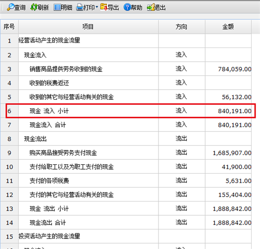 - 选择明细行,点击〖明细〗按钮,可联查现金流量明细表。