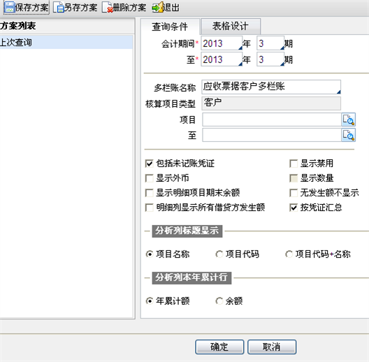 例如:应收账款设置了“客户”辅助核算,使用多栏账查询,可以以应收账款、客户为分析对象进行查询。