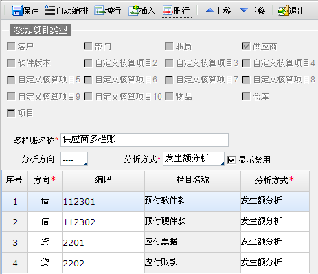 【第三步】设置完成,点击〖保存〗按钮,完成项目综合多栏账的设置工作。点击〖插入〗按钮可插入行;点击〖删行〗按钮,可删除行;点击〖上移〗〖下移〗按钮可改变行的位置。