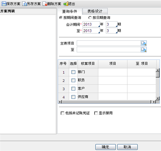 - 核算项目类型:指系统中可用的核算项目的类型,可以是部门、客户、供应商以及职员等;核算项目,指定具体的核算项目;可按照编码范围指定。