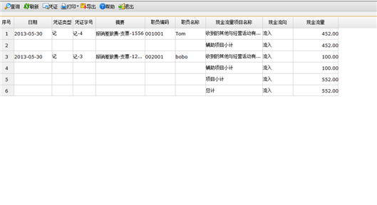 【第二步】输入查询条件后,点击〖确定〗按钮进入辅助项目现金流量查询页面,如下图所示: