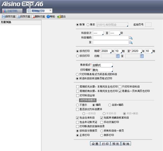 - 若期初有余额,本期无发生也打印:若勾选,则期初有余额,查询期间无发生额的科目也打印。期初无余额,查询期间无发生的不打印。
