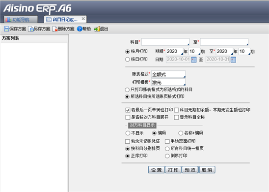 - 科目无期初余额,本期无发生额也打印:若勾选,则期初无余额,查询期间无发生额的科目也打印。否则不打印。