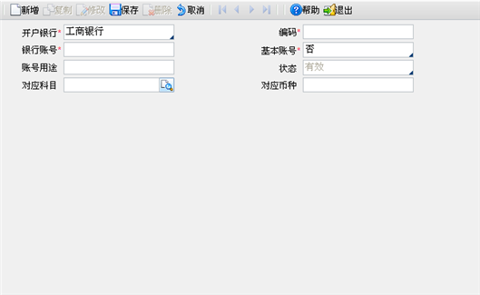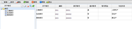【主要功能】对企业的银行账号进行新增、修改、删除等功能。此外,可在该菜单下维护开户银行信息。如下图所示。